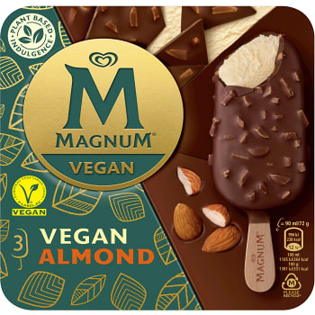 Magnum Vegan Almond, en len vegansk vaniljglass med ett lyxigt lager vegansk choklad och krispiga mandelbitar.