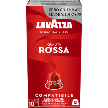 Lavazzas kaffekapslar, kompatibla med Nespresso* Original-maskiner, är en perfekt balans mellan en äkta italiensk espresso och Lavazzas ständigt pågående engagemang kring hållbarhet. Dessutom i aluminiumkapsel med noll CO2-utsläpp**. Qualità Rossa är ett ikoniskt kaffe i Italien med över 50 års historia. Den noggrant balanserade andelen Robustabönor från Afrika och sydöstra Asien ger kaffet den karaktäristiska fylliga smaken och de varma tonerna av choklad. De sydamerikanska Arabicabönorna ger kaffet sin sötma och nötiga toner. Tillsammans ger det en fantastisk, sammetslen balans. Mellanrostat och intensitet 10/13. *Lavazza är inte ansluten till, stött eller sponsrad av Nespresso. **Lavazza bidrar med netto noll CO2-utsläpp genom att fullt ut klimatkompensera för dessa produkter.