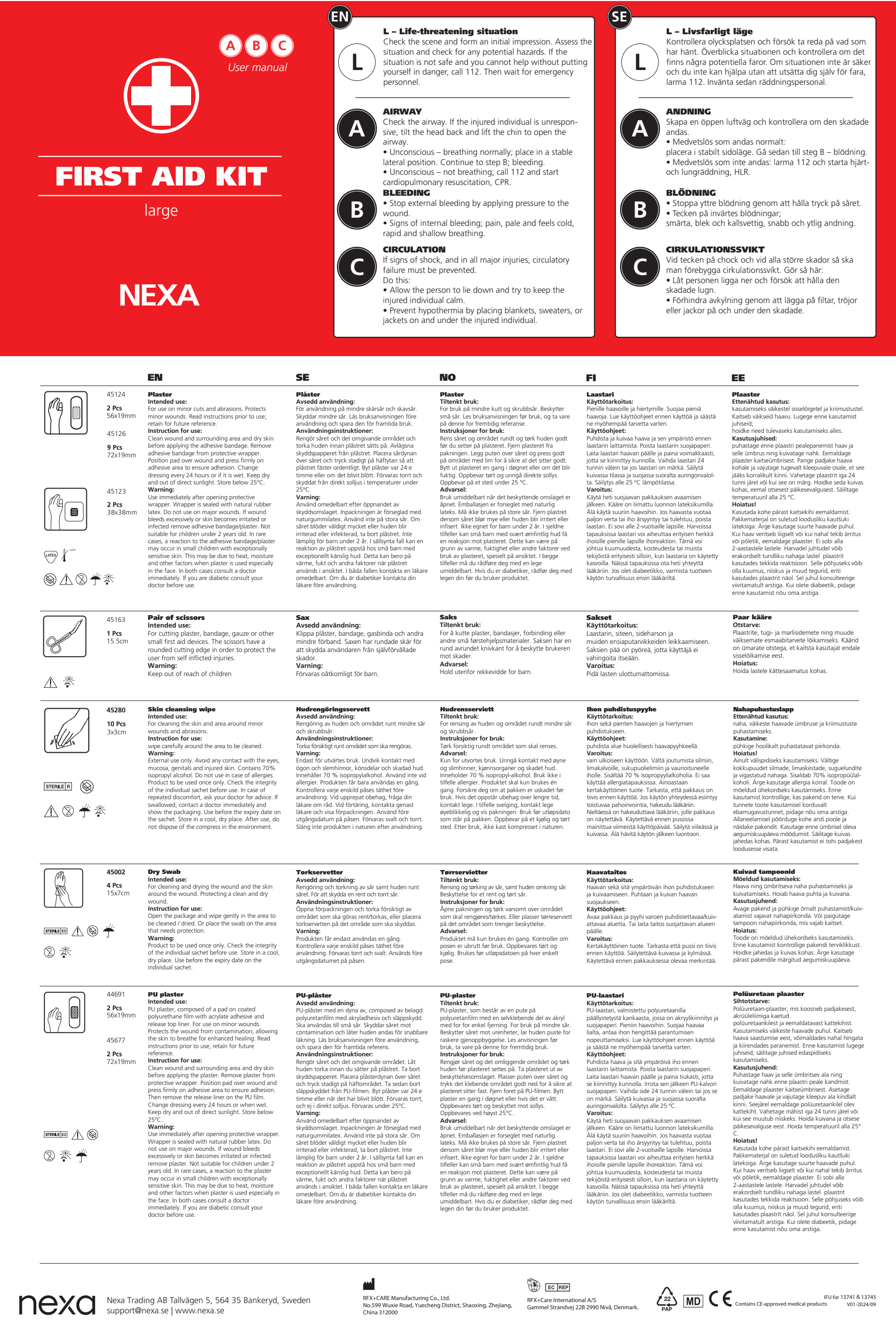 Första Hjälpen Väska Large NEXA Första hjälpen-väska är en genomtänkt och välorganiserad lösning med 64 nödvändiga delar för snabb och effektiv sårvård. Tack vare smarta fack och en praktisk design hittar du enkelt det du behöver – oavsett om det gäller mindre skärsår eller större skador. Perfekt att ha i hemmet, bilen, båten eller på äventyr. En trygghet för alla situationer där snabb hjälp kan göra skillnad. Yttermått på väskan 26,5x 22 x6,5cm ▪ Plåster i olika storlekar ▪ Hudrengöringsservett ▪ Torkservetter ▪ PU-plåster ▪ Sterilt sårförband ▪ Trekantsbandage ▪ Elastiskt bandage ▪ Säkerhetsnålar ▪ Andningsskydd ▪ Ögonskölj ▪ Nödfilt ▪ Vinylhandskar ▪ Metallpincet ▪ Sax